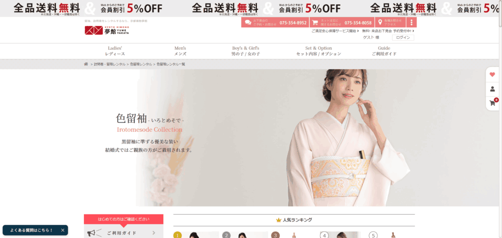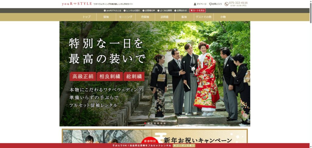 ユアスタイルは、礼装向けの着物全般のレンタルサービスを専門に扱うレンタルサービスとして、全国から利用できる利便性と高品質な品揃えを特徴としています。公式サイトでは、格式ある場にふさわしい色留袖を中心に、プロが仕立てた着物を多数そろえており、自宅にいながら安心して選べる点が魅力です。